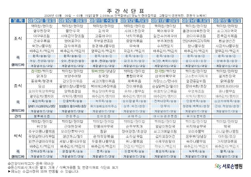 2026년 3월 둘째주 항암 식단표 입니다.