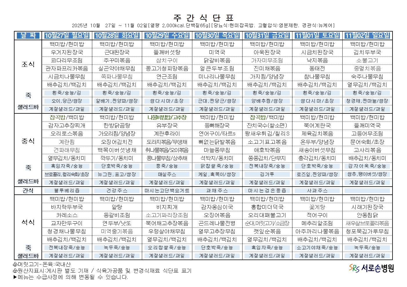 2025년 10월 다섯째주 항암 식단표 입니다.