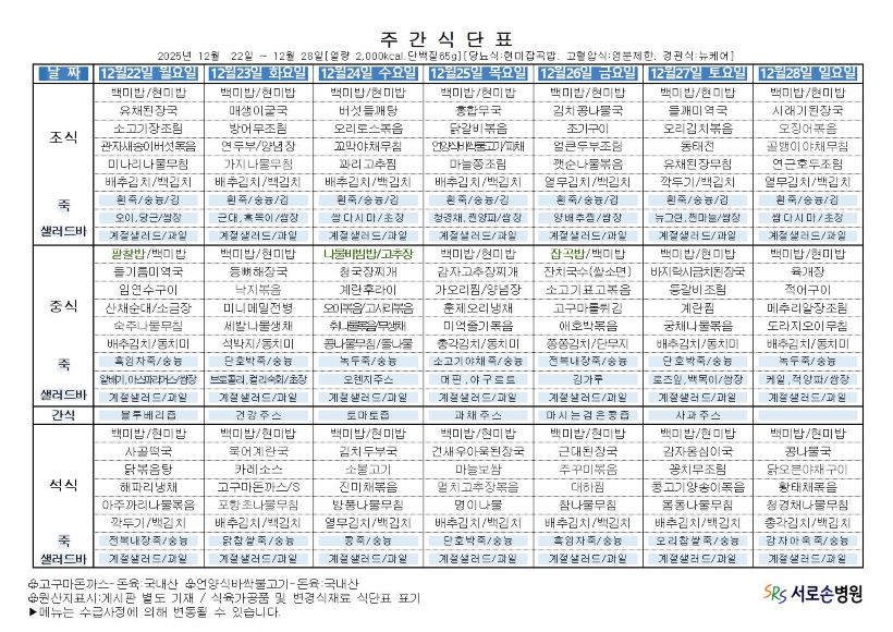 2025년 12월 넷째주 항암 식단표 입니다.
